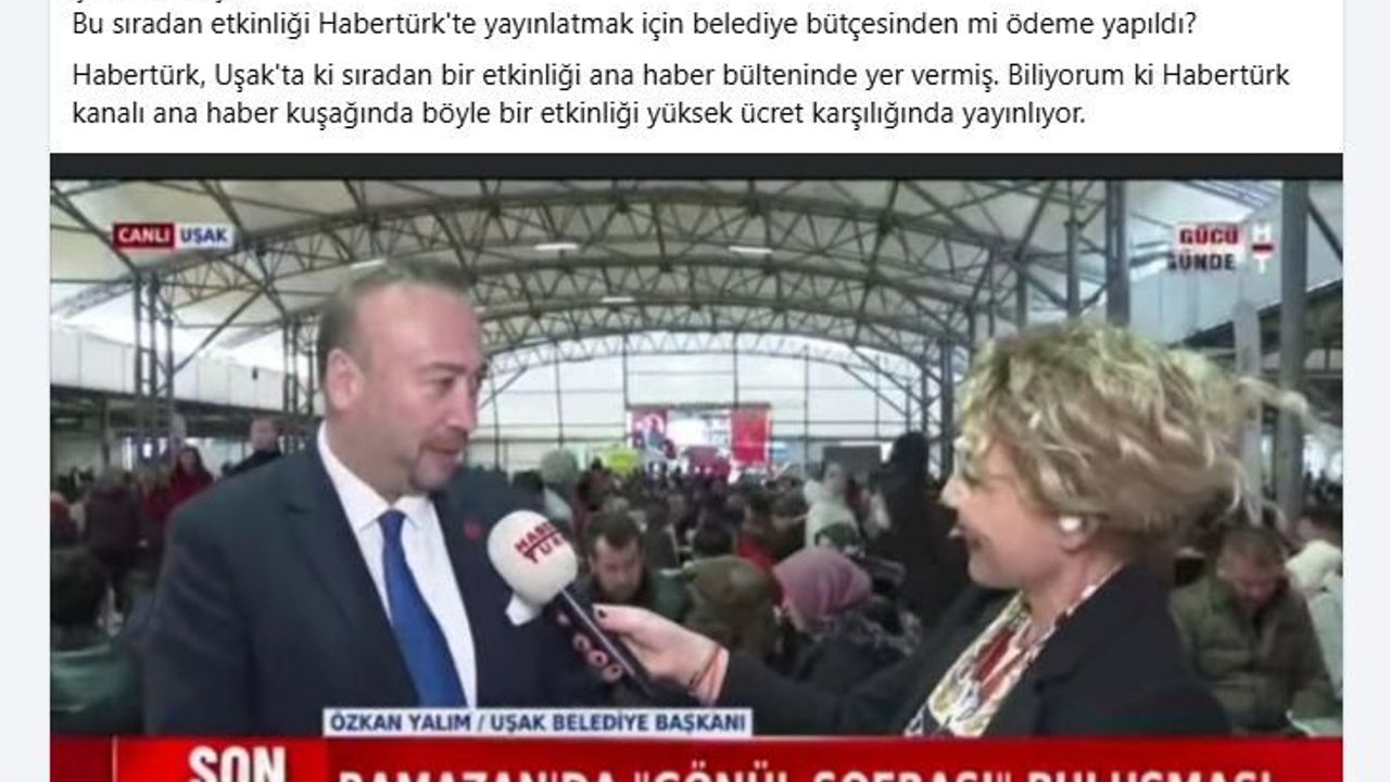 Söz konusu yayın sonrası Uşaklı siyasetçi ve aktivist Hakan Savaş, sosyal medya hesabından dikkat çeken bir paylaşım yaptı. Savaş paylaşımında, “Bu sıradan etkinliği Habertürk’te yayınlatmak için belediye bütçesinden mi ödeme yapıldı? Habertürk’ün ana haber kuşağında bu tür yayınların yüksek ücret karşılığında yer aldığı biliniyor. Bizim paramızla bize reklam yapıyorlar” ifadelerini kullandı.
